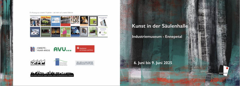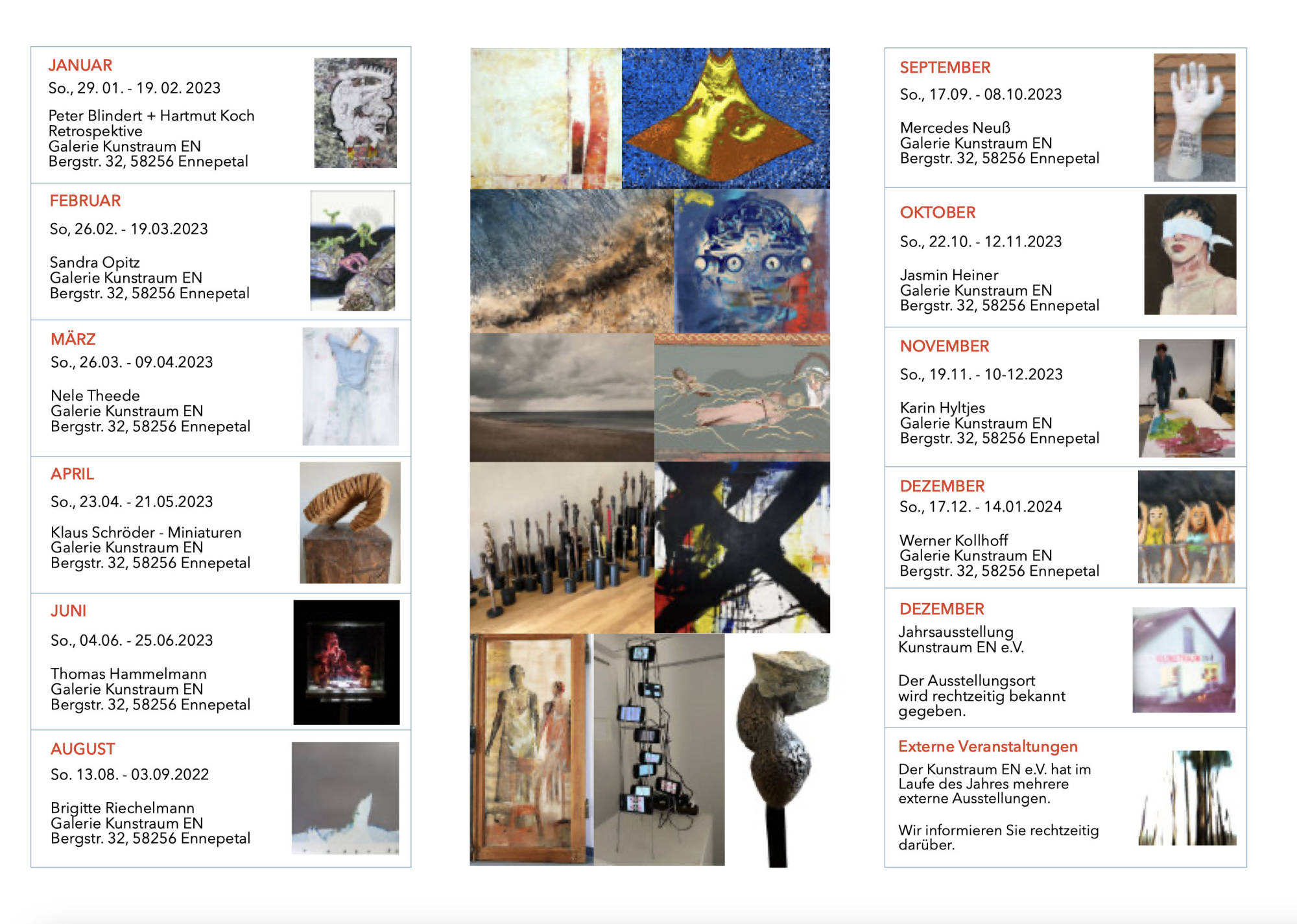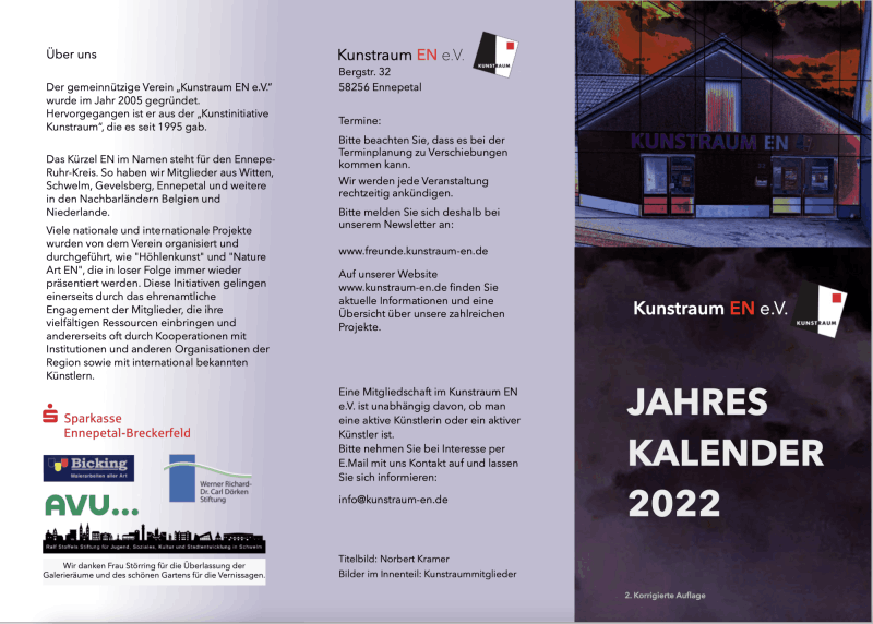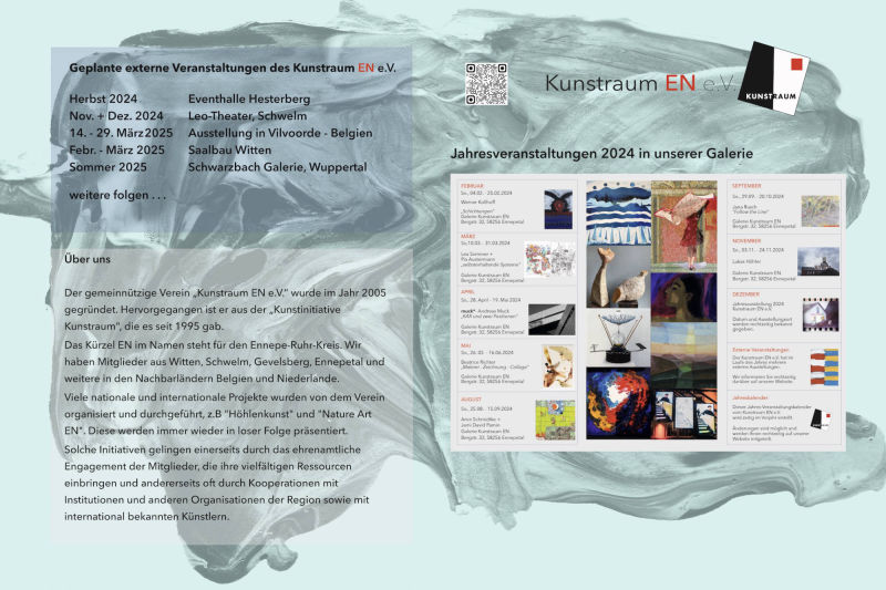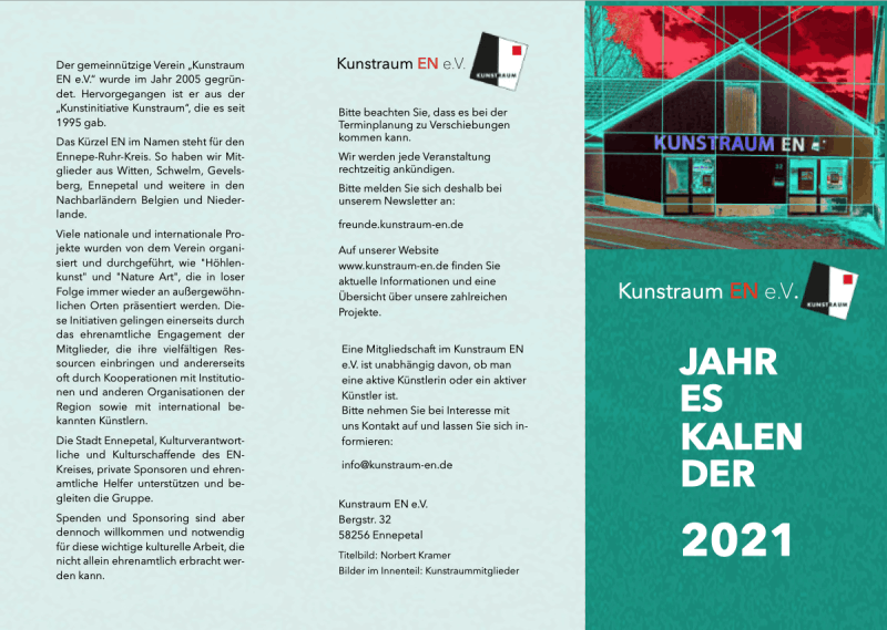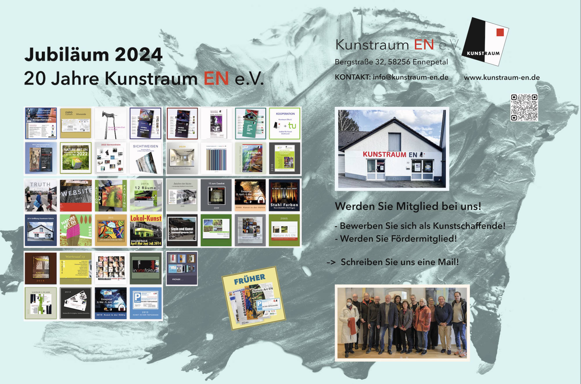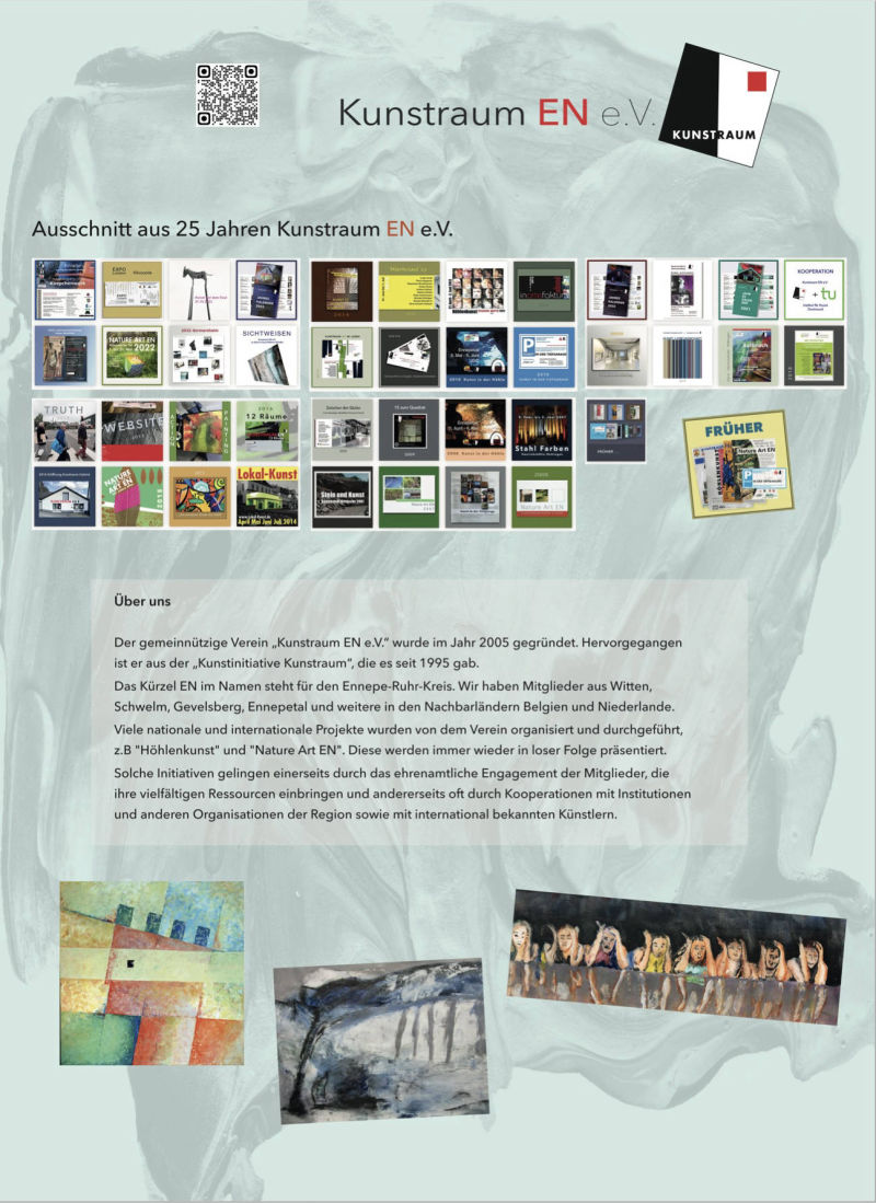 Zu vielen Veranstaltungen für unseren Kunstraum EN e.V. entwerfe ich Plakate, Einladungskarten, Banner, Kataloge und auch Bücher. Die Plakate wurden in DIN A3, DIN A1 und bis 1 x 6 m und 3 x 6 m gedruckt.