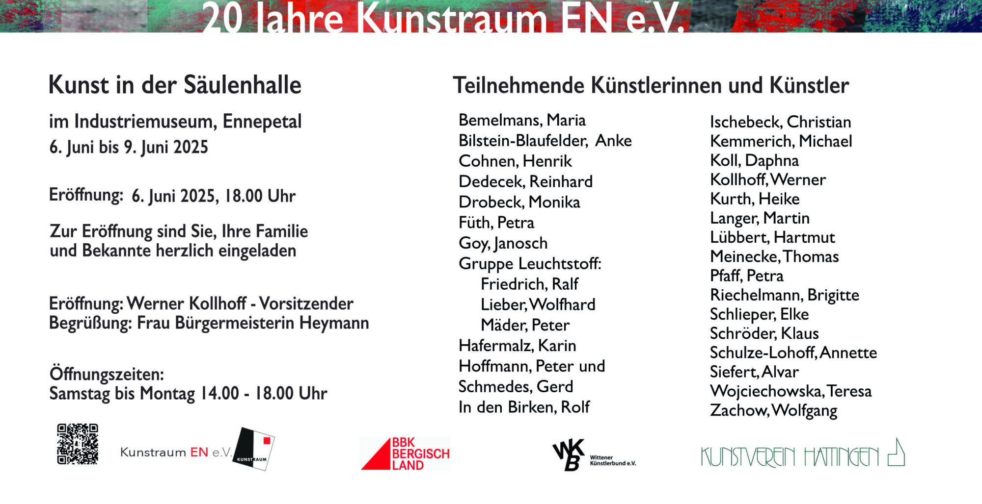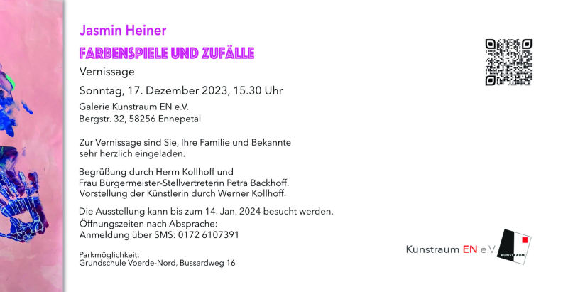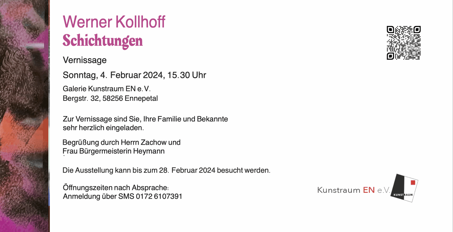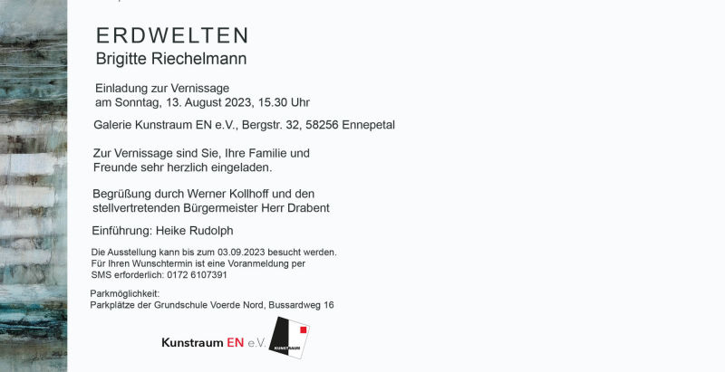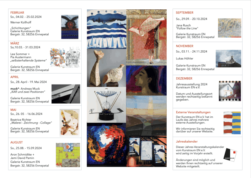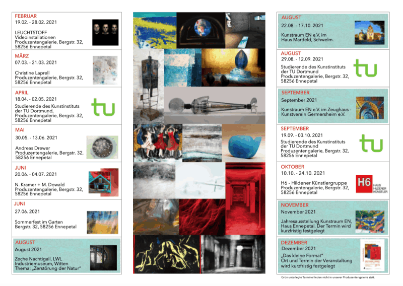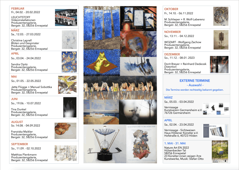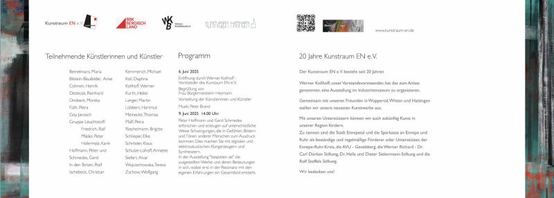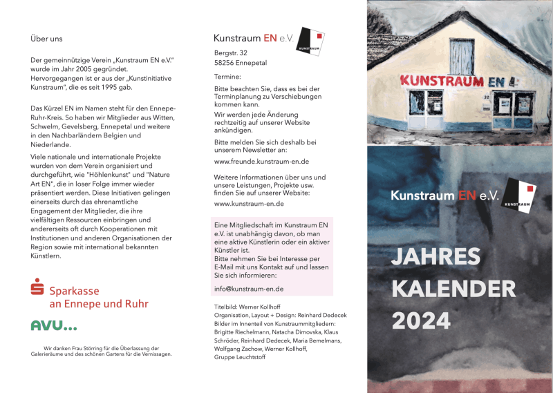 Zu vielen Veranstaltungen für unseren Kunstraum EN e.V. entwerfe ich Plakate, Einladungskarten, Banner, Kataloge und auch Bücher. Die Plakate wurden in DIN A3, DIN A1 und bis 1 x 6 m und 3 x 6 m gedruckt.